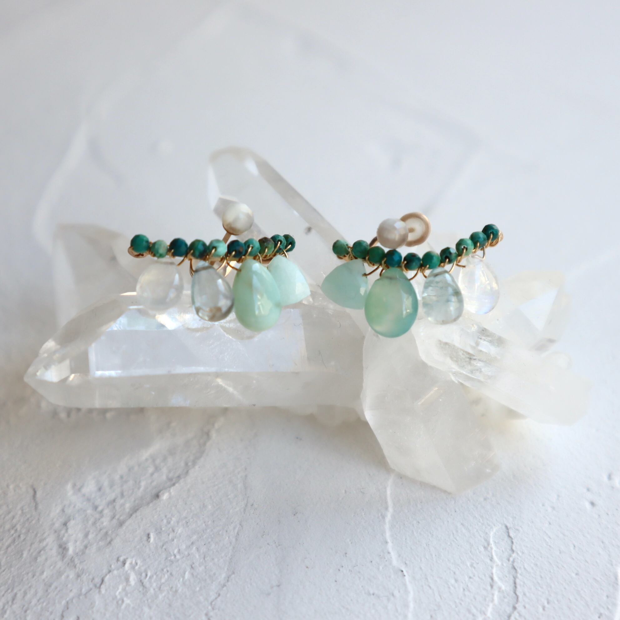 ムーンストーンのポストピアスのキャッチ部分に天然石を4つ並べた、バックキャッチタイプの片耳ピアスです。