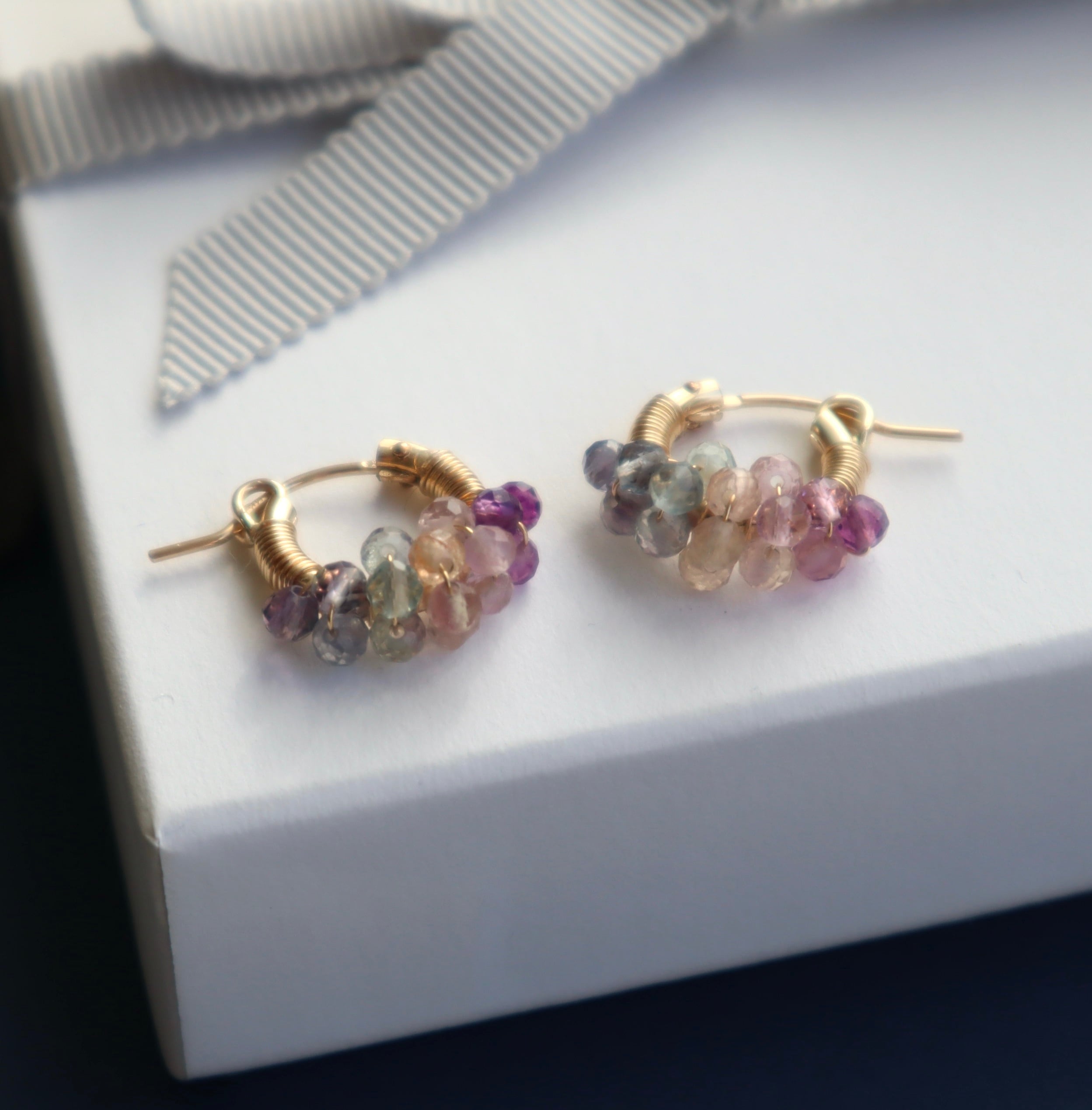 色味の違うフローライトを、フープにひとつひとつ巻きつけたピアス。