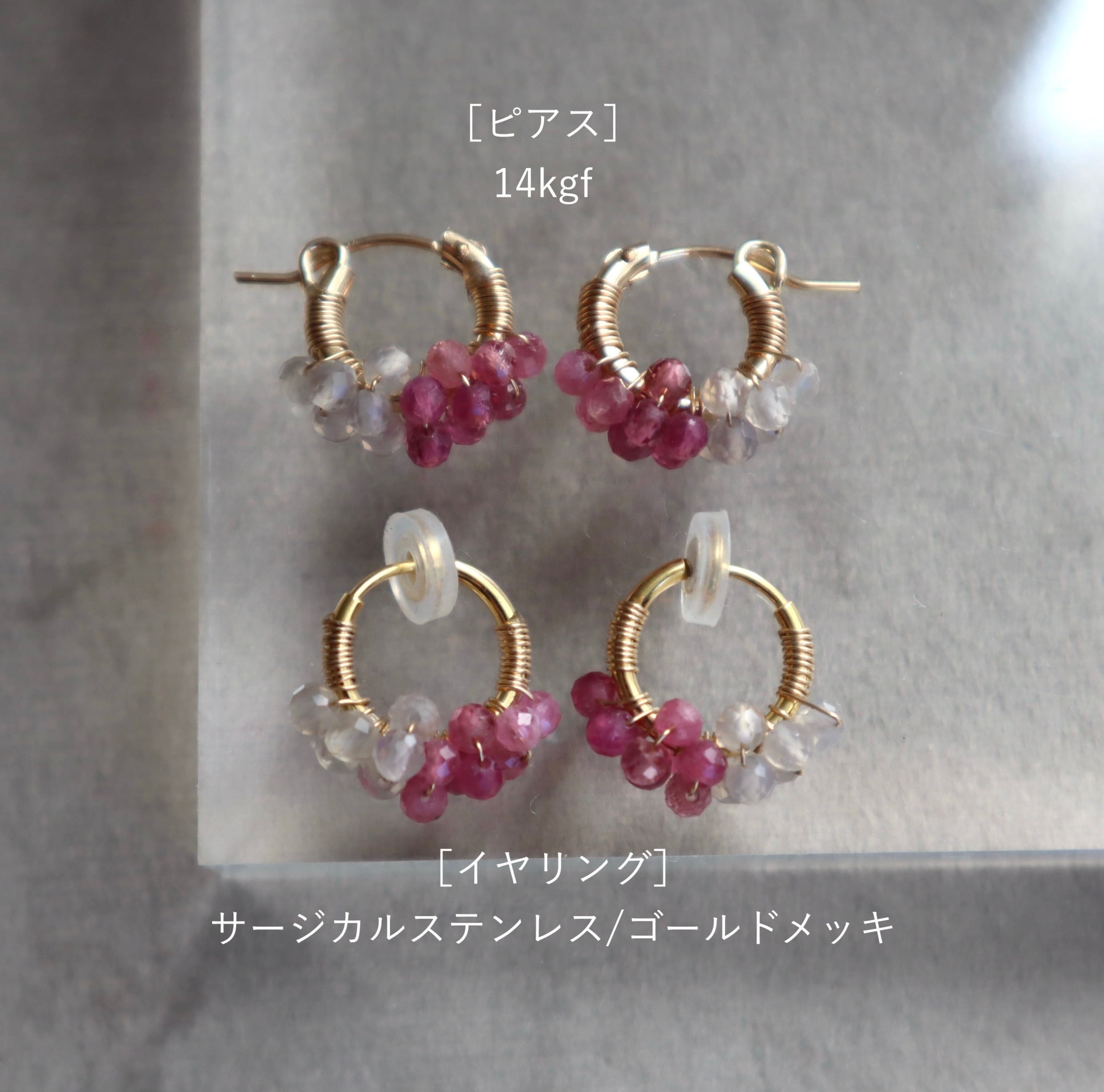 [ピアス]petit berries hoops/14kgf ピンクトルマリン×グレーオニキス