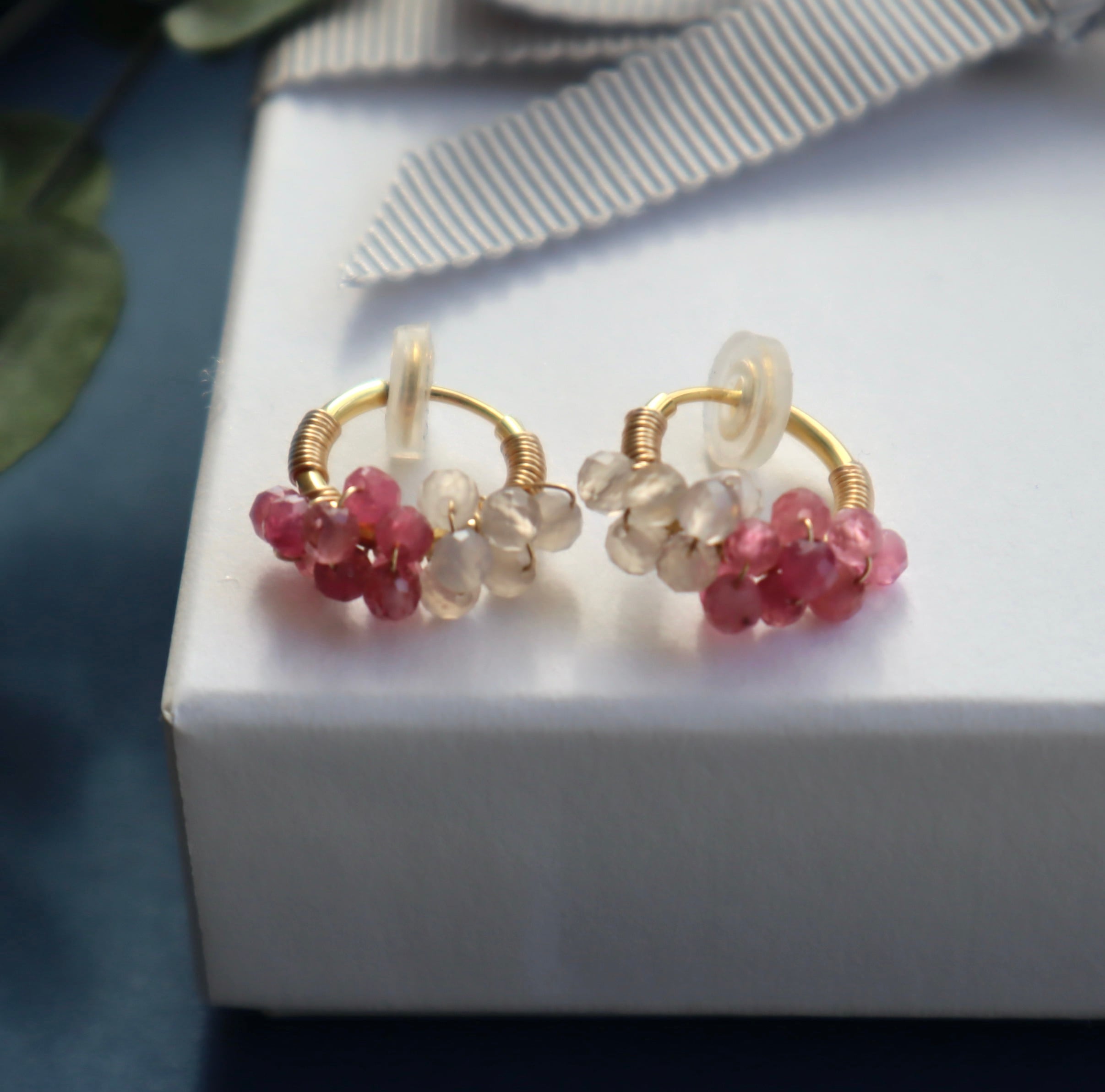 ピンクトルマリンとグレーオニキスを、ハーフ&ハーフにフープに巻きつけたフープイヤリング。