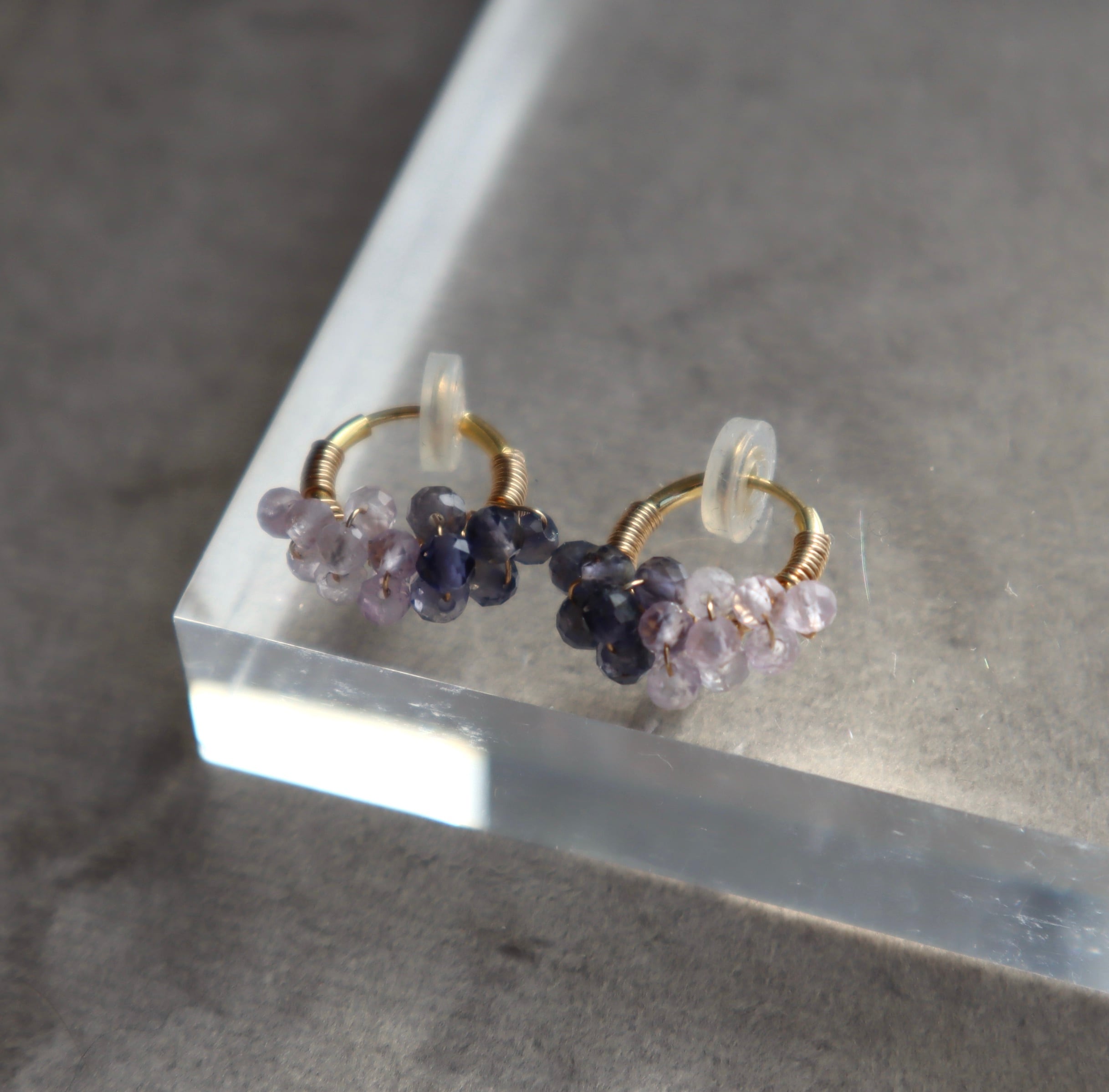 すみれ色のアイオライトとラベンダーカラーのスコロライトを、ハーフ&ハーフにフープに巻きつけたフープイヤリング。
