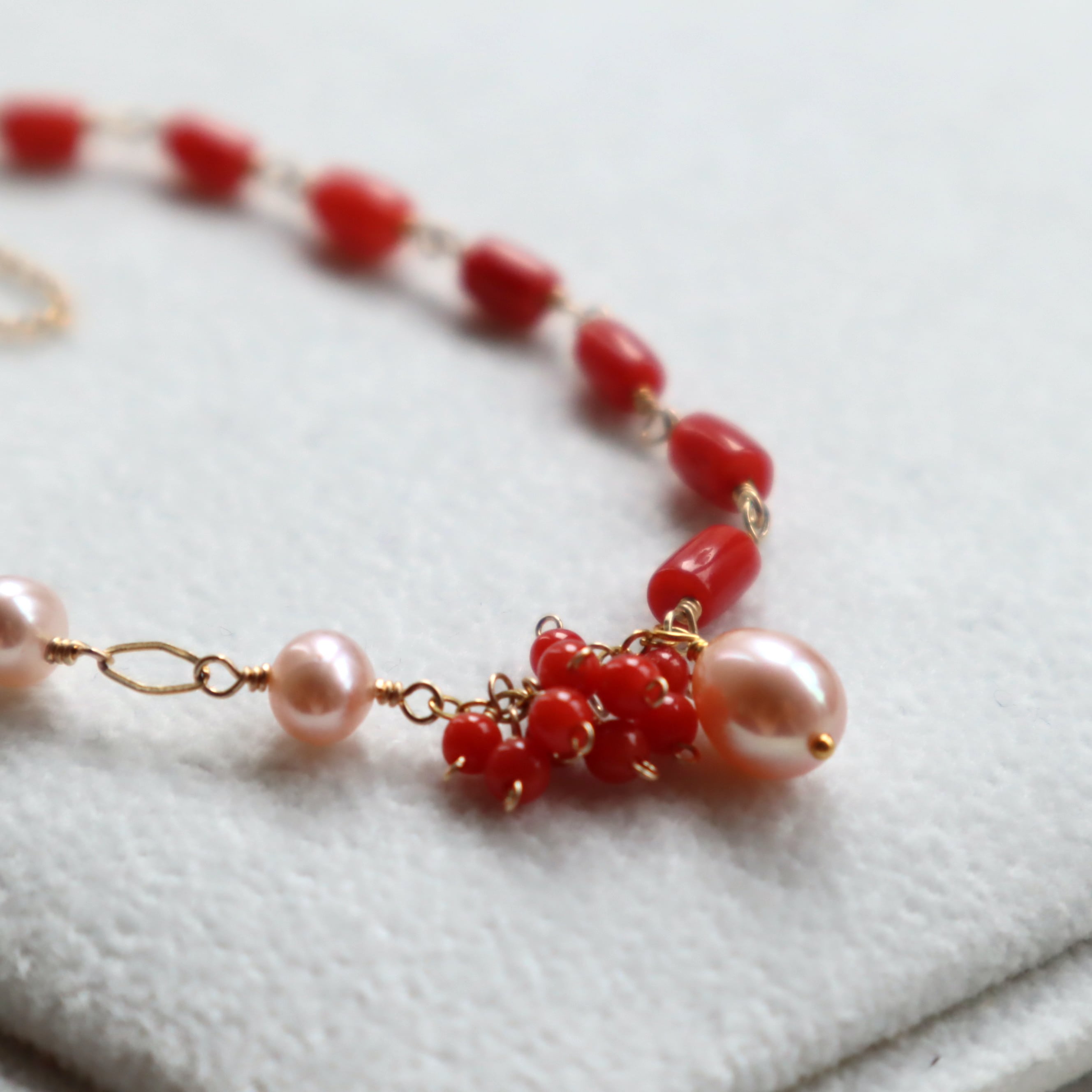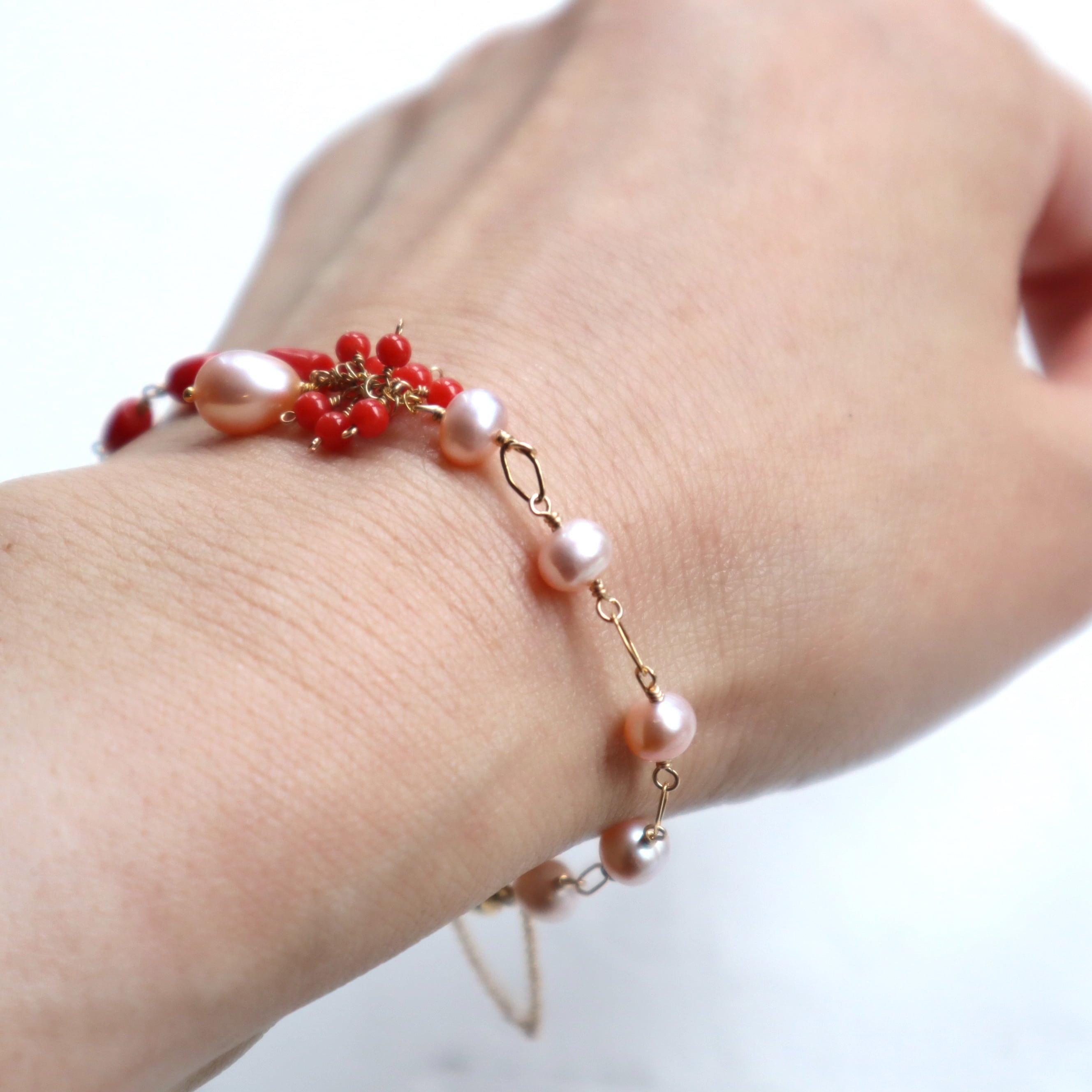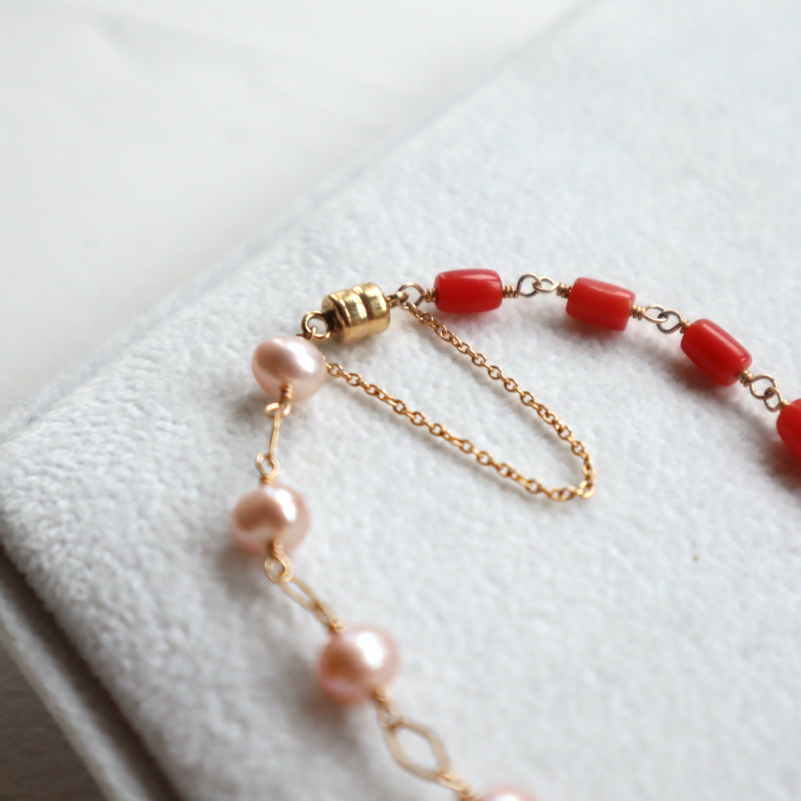 天然色の赤珊瑚にピンクの淡水パールを合わせたブレスレット。
