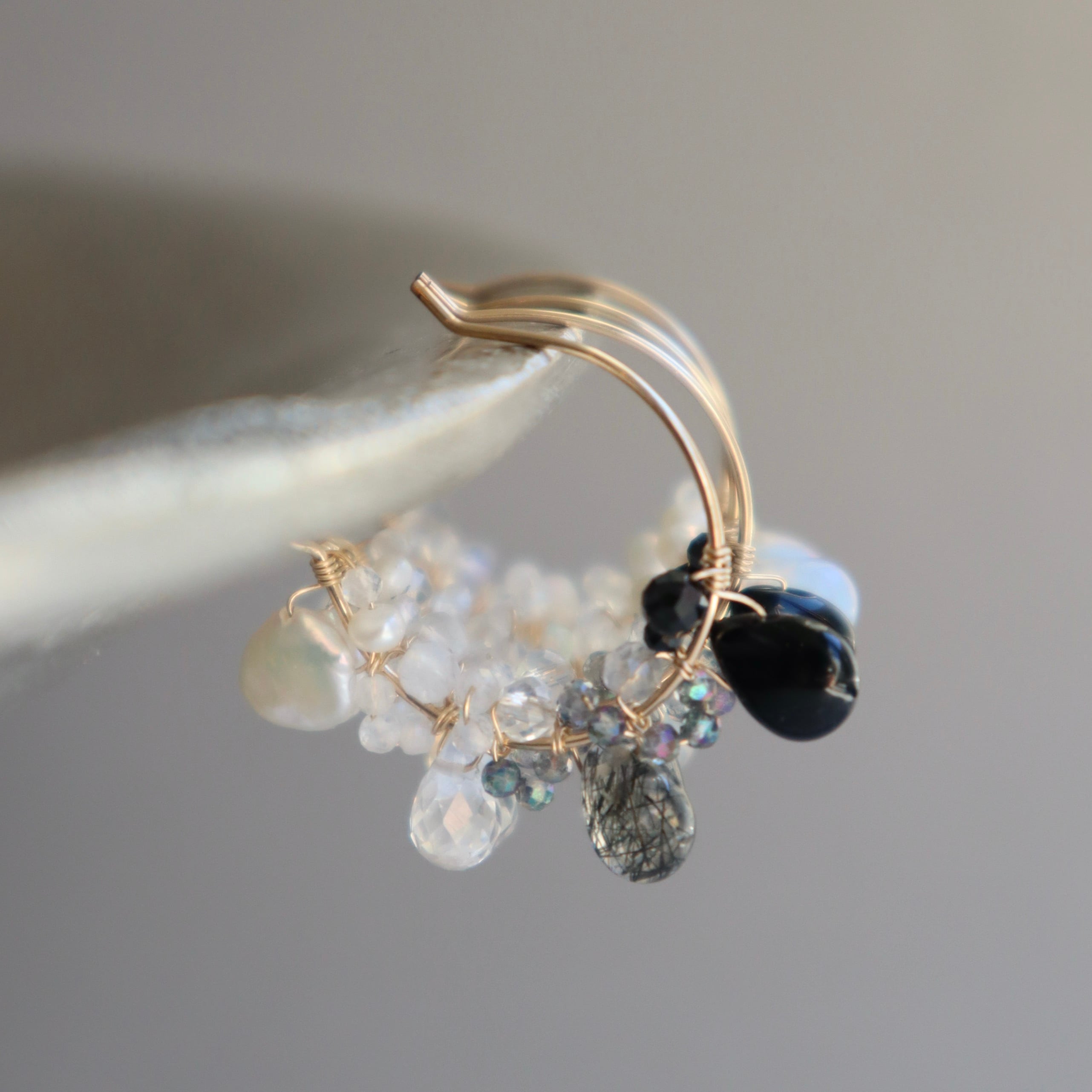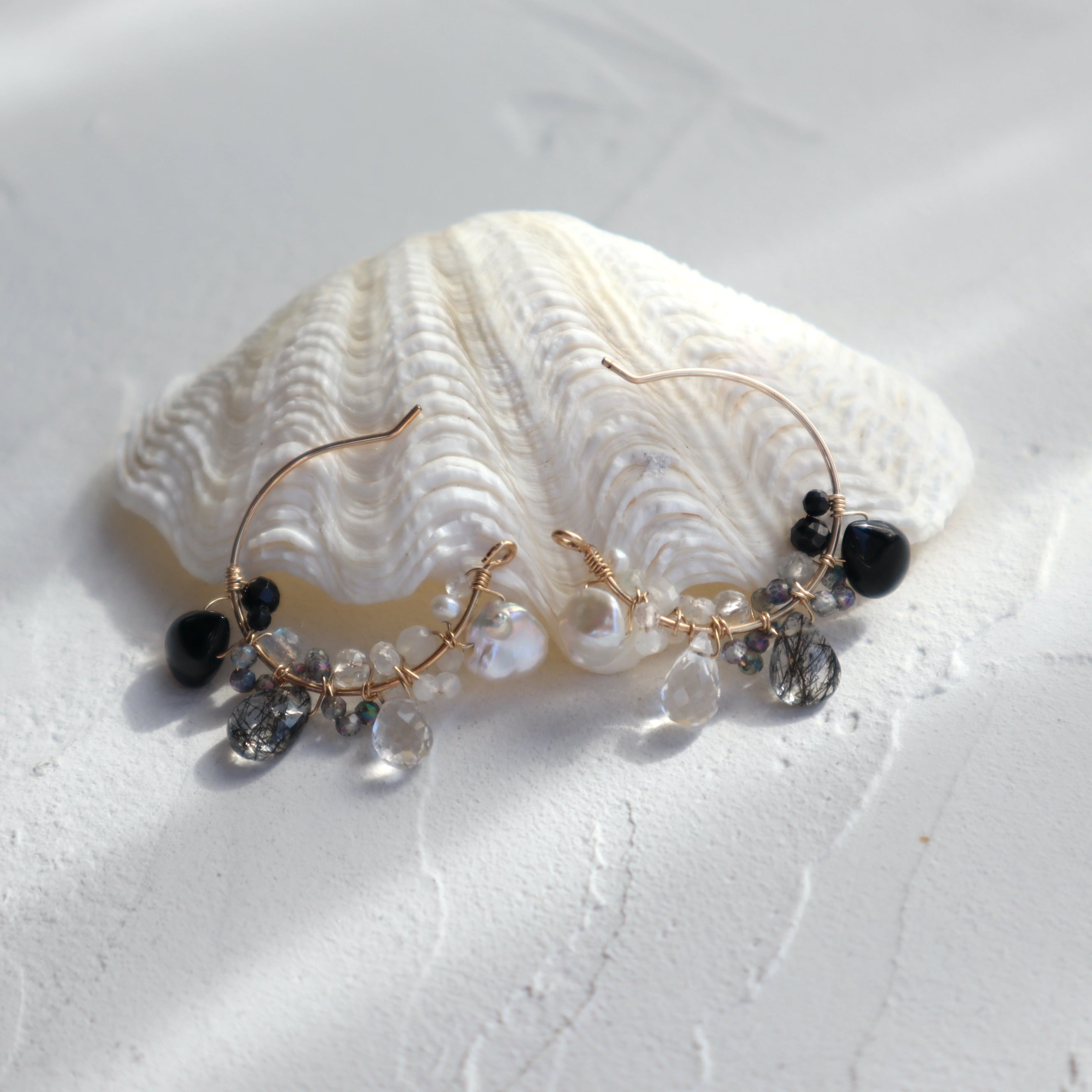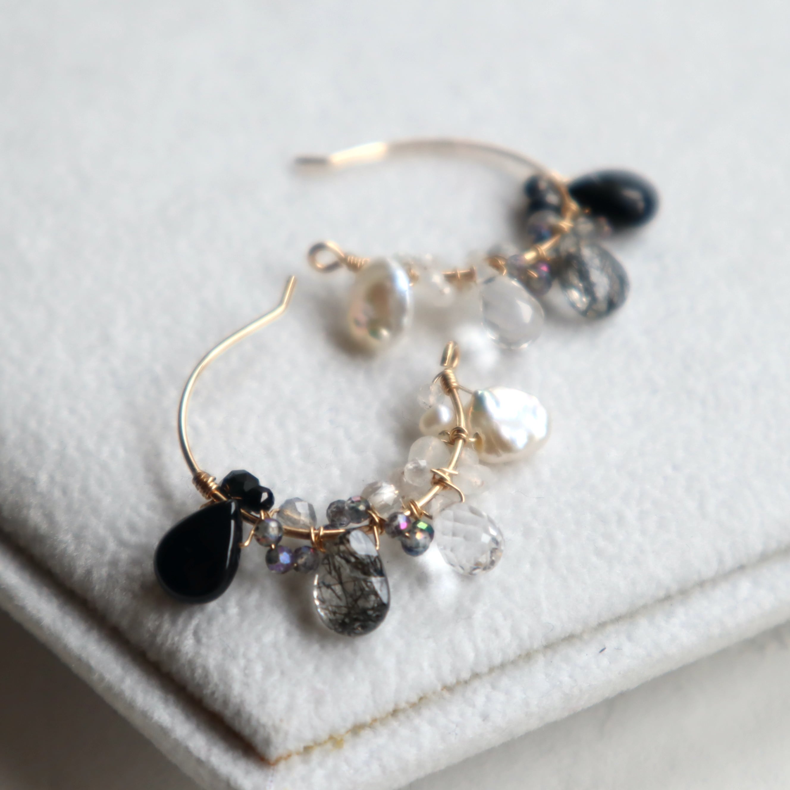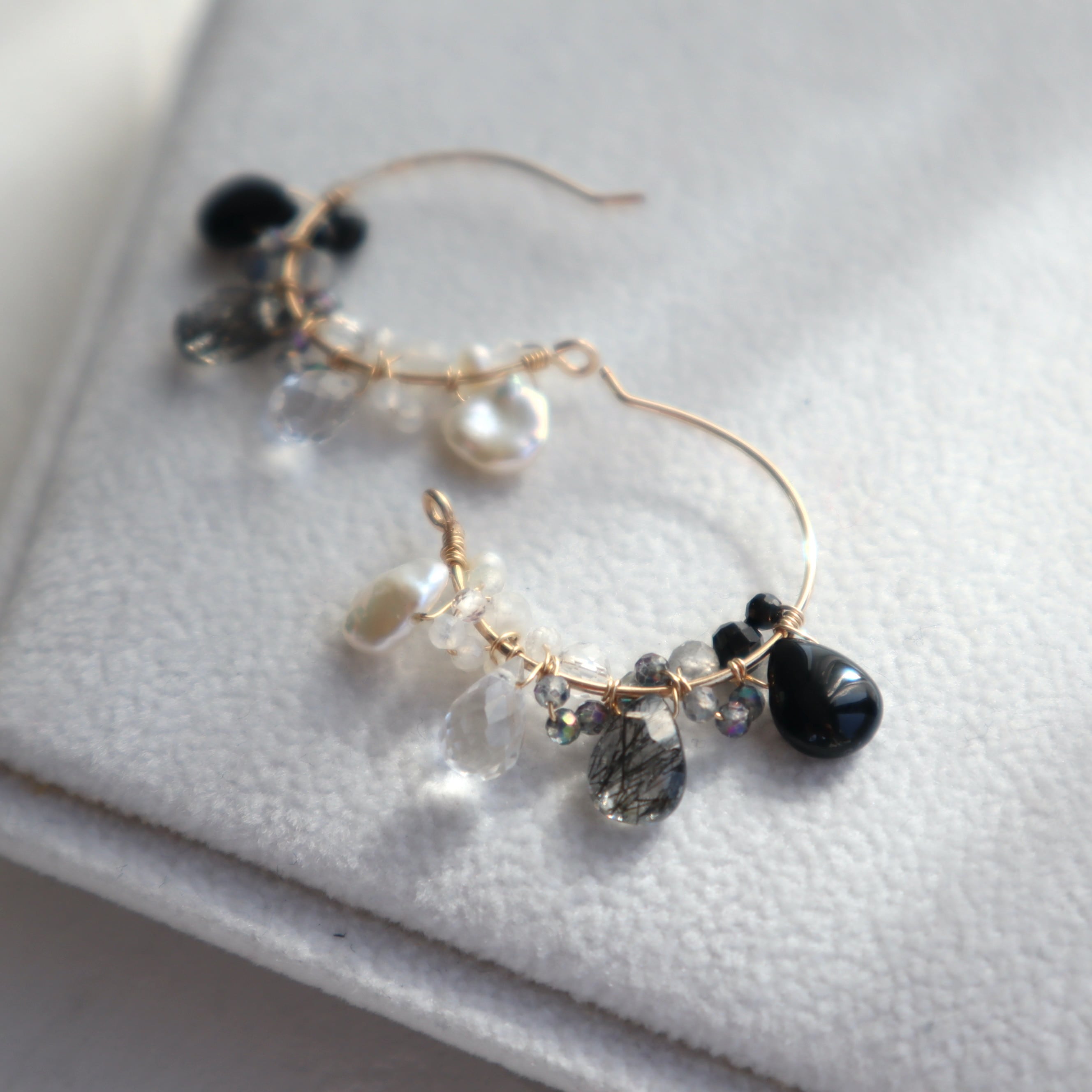 ブラックオニキス、トルマリンインクォーツ、水晶、淡水パールをグラデーションに並べ、大人カラーにまとめたフープピアスになります
