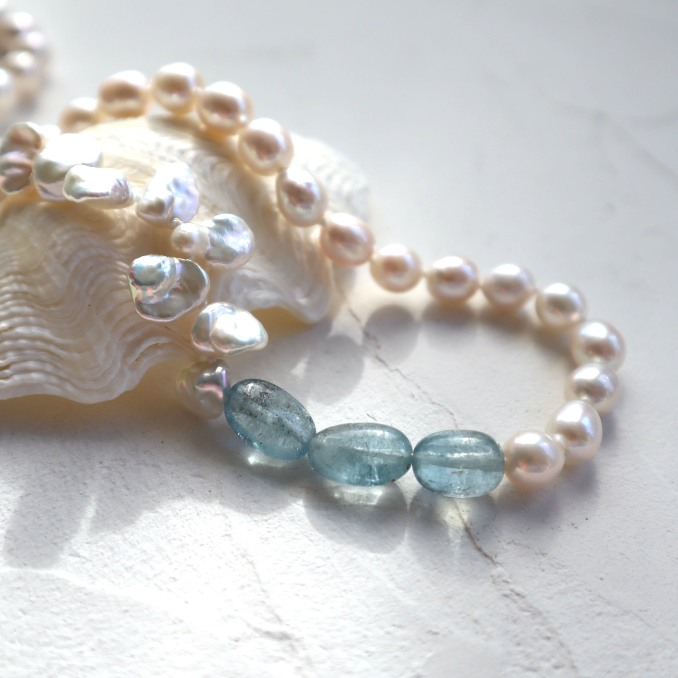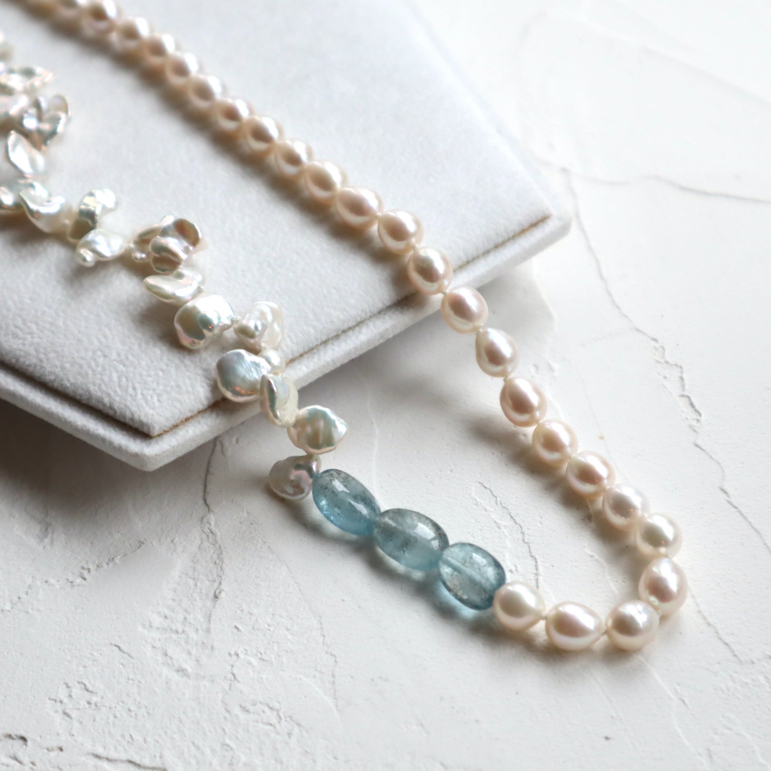 パールも花びら型とドロップ型をミックスし、モスアクアマリンと合わせてアシンメトリーなデザインに。糸でひとつひとつ繋いでいるので、とても柔らかく着け心地の良いネックレスです。